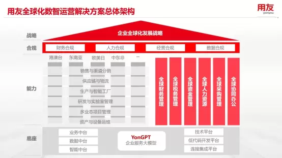 无论哪种模式,全球化应用、本地化服务、数据安全与合规都是全球化企业在数智化系统建设和运行中最关切的三个议题。针对于此,用友提可以从四个视角规划和建设企业的全球化竞争力。即战略、合规、能力、底座。