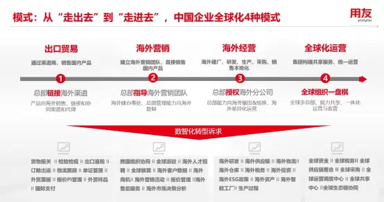 在用友服务中国企业全球化的过程中,发现他们会普遍遇到政治环境、文化环境、经济环境、品牌营销、产品服务、全球管控等挑战。中国企业全球化也经历了一个演进过程,即从最初走向国际市场的“走出去”演变打了逐步进军和融入当地目标市场的“走进去”。从“走出去”到“走进去”,用友总结出了四种全球化运营模式:出口贸易,通过渠道商,销售国内产品;海外营销,建立海外营销团队;海外经营,在海外建厂,研发、生产、采购、销售本地化;全球化运营,集团构建共享服务、统一运营。