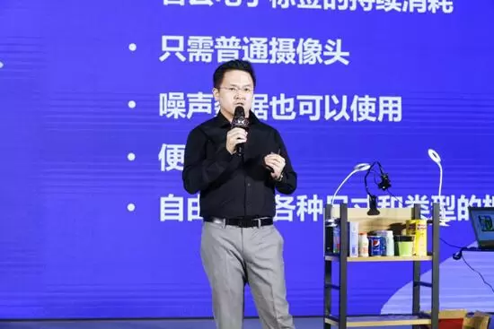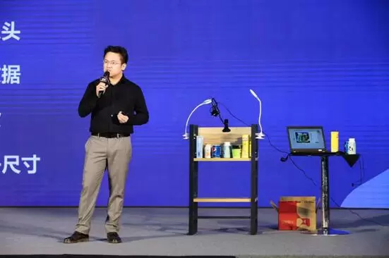 演讲开场,黄鼎隆博士展示了码隆科技智能货柜纯视觉商品识别解决方案的 Demo。在舞台上他摆出一个简易货柜,架上一个普通摄像头,1 分钟便把普通货柜改造成智能货柜。现场立刻可以调用 ProductAI 平台的商品识别服务,展示实时视觉购物和智能上货的功能。
