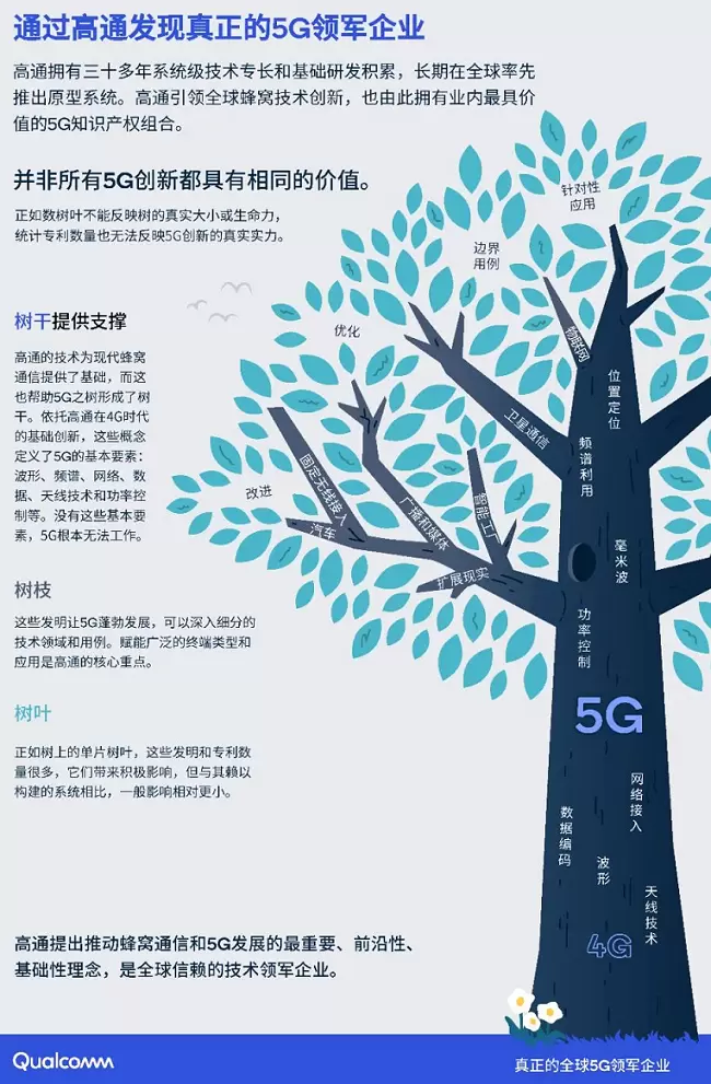 钱堃还指出,目前全球标准化体系运作良好,是因为创新企业有动力为标准贡献最好的技术。以高通为例,在5G商用前十年,高通就开始研究LDPC低密度奇偶校验信道编码技术,此后将该技术加入5G标准,从而让5G支持数十Gbps的数据传输。此前高通提出了一个“5G创新之树”的概念,并将构成5G关键的、核心的技术称为树干。在树干的基础上延伸,为5G向各个领域的应用扩展提供技术框架,称之为树枝。基于树枝,又延伸向广泛具体产品和应用,称之为树叶。值得注意的是,高通不仅专注于驱动树干和树枝成长的技术,还积极与产业伙伴拓展5G在各个行业的落地应用。