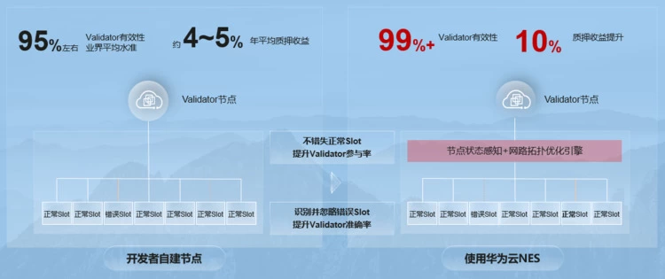 开发者独立运行验证节点的有效性通常是95%左右,而本次发布的分布式验证解决方案通过节点引擎服务NES的加持,可以兼顾可靠和高效,支持开发者验证节点独立运行的有效性提升至99%+;对应地,目前开发者自建验证节点获得的奖励收益大概为5%左右,而采用分布式验证解决方案中的NES,可以将验证节点的奖励收益提高10%。
