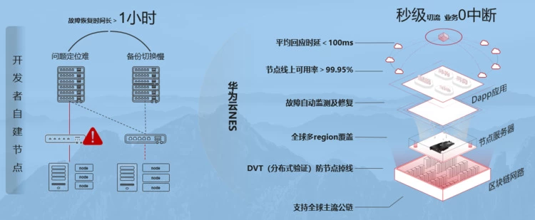 相比开发者自建验证节点所需的工程投入时间长达数小时甚至数十小时,其中全节点一旦发生单点故障,恢复时长也会达到小时级,分布式验证解决方案的节点构建效率比自建模式提高了数倍,且保障节点100%在线稳定运行,保障业务不中断。