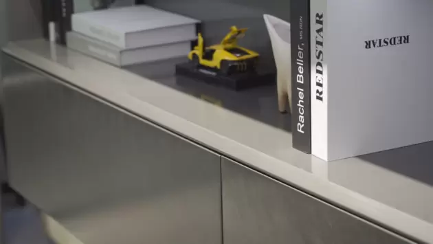 电视柜采用两边水晶宫对称设计,3C钢化玻璃给家居生活增加一层安全防护,同时提升空间的高级感。电视采用悬浮式设计,既可收纳,又能将壁挂电视嵌入其中,厚度能保证储物的进深,美观上亦做到了风格协调。