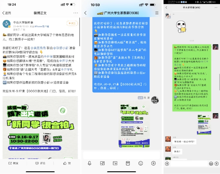 为近距离与学生用户互动交流,活动特在广州大学城热门商圈设置主题快闪活动,9月16至17日,周末两天落地广州GOGO新天地,辐射中山大学、广东外语外贸大学、广州大学等十余所高校,在开学月周末举办「新同学很合拍」快闪活动,承载人流高峰,掀起出片狂潮。 为提前预热活动,吸引人流,活动前夕,在广州大学城多所高校的线上QQ/微信社群、微博等发出来自美图秀秀与联想小新的“周末出片邀请”,多触点精准辐射触达大学城新同学,点对点邀约传播造势。