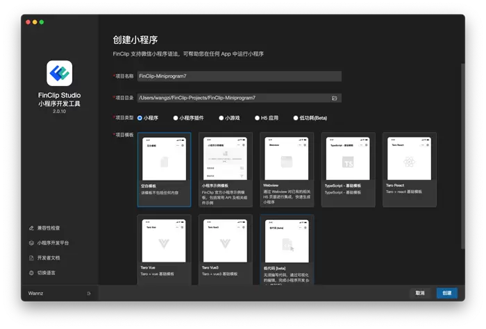 在下文中,我们分别通过字节小程序开发者工具与支付宝小程序开发者工具创建一个默认的项目模板,并通过 FinClip Studio 导入来体验完整流程。