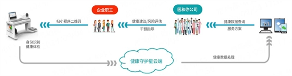 健康守护星的体验流程为:员工自助扫描二维码,根据手机端微信小程序和平板电脑的指引开始体检;体检结束后,云端对用户的健康数据进行处理,从而对异常数据提出预警;医和你通过接口调取用户的健康数据进行分析评估和干预服务,根据给企业提供的服务方案提供服务。
