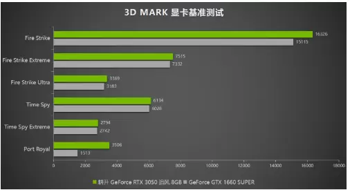 为准确评估显卡的性能,我们使用能够提供准确跑分结果的软件"3DMark"进行各项基准测试。由于GTX 1660 SUPER没有RT核心,但在GeForce Game Ready 425.31 WHQL驱动之后也能支持光线追踪,因此加入Port Royal项目的测试。从结果来看,耕升GeForce RTX 3050追风8GB显卡在代表DX11游戏性能的FSE和FSU测试中领先GTX 1660 SUPER约1%;代表DX12性能的Time Spy和Time Spy Extreme测试中领先1%;代表光追性能的Port Royal测试中,搭载全新第二代光追单元的耕升GeForce RTX 3050追风8GB显卡的性能超过GTX 1660 SUPER的31%!在所有测试模式中,耕升GeForce RTX 3050追风8GB显卡显著压制NVIDIA GeForce GTX 1660 SUPER显卡,堪称最佳的入门级光追游戏显卡!