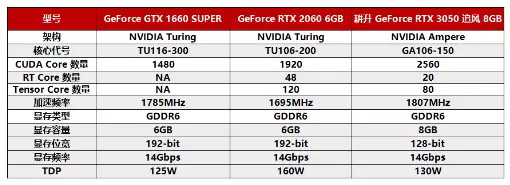 在正式开始测试之前,我们先来对比一下该显卡和上一代RTX 2060显卡的规格参数。耕升GeForce RTX 3050追风8GB显卡与NVIDIA GeForce RTX 2060 6GB相比,CUDA核心数增加30%,达到2560个!显存规格相同,但容量比上一代RTX 2060显卡增加了2GB。而与NVIDIA GeForce GTX 1660 SUPER相比,CUDA核心数增加72%!显存规格相同,但容量比NVIDIA GeForce GTX 1660 SUPER显卡增加2GB。