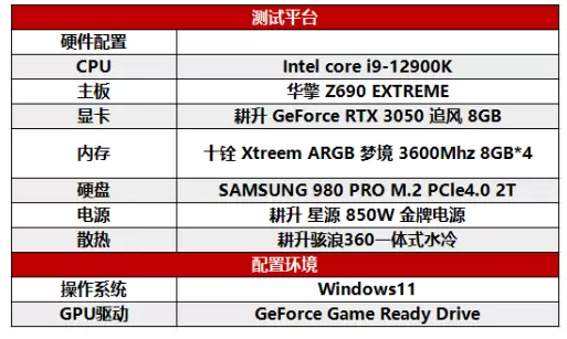 本次测试平台选用Intel i9-12900K CPU搭配华擎 Z690 EXTREME主板,内存采用十铨高频内存 x4,硬盘方面则选择了目前性能出众的三星980 PRO SSD。电源和散热方面分别选用了耕升的星源850W金牌电源和骇浪360一体式水冷。这套配置能够确保耕升GeForce RTX 3050追风8GB显卡稳定发挥出其在1080P高帧率游戏体验方面的优势。