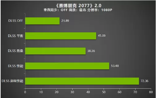 通过《赛博朋克2077》自带的基准测试后可以看到,哪怕只是1080P下的最高画质,未开启DLSS时也只能达到平均21.89帧,可见《赛博朋克2077》这款光追神作的配置要求还是很高的。而在开启DLSS技术后,帧数明显提高,特别是在开启DLSS超级性能后,能够到达平均72.36帧,已经可以流畅的运行游戏。
