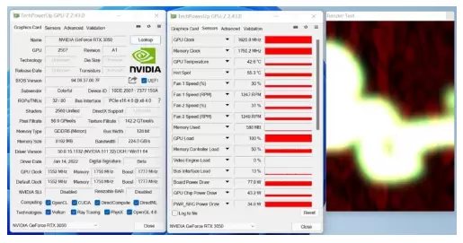 此外,在进行游戏实际测试之前,先来看一下耕升GeForce RTX 3050追风8GB显卡的功耗控制能力。使用负载软件"Furmark"对显卡进行强压测试。在此之前,CPU-Z显示显卡的待机温度为42.6℃(显卡具备低温风扇停转功能);开启Furmark进行显卡压力测试,并等待显卡的温度和功耗稳定后,我们得出显卡的最终功耗为129.1W,显卡温度为55.5℃。这款入门级显卡不仅性能出色,而且功耗控制非常出色。在正常情况下,显卡的负载程度大多低于Furmark测试状态,因此显卡的功耗和温度表现还有进一步提升的空间!