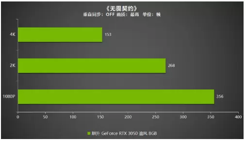 对于《无畏契约》而言,可以看到在1080P分辨率下,游戏在开启DLSS情况下,能达到平均356帧的可怕性能,而在2K分辨率下则来到268帧的平均帧数,在4K分辨率下也能保持平均153帧的极高帧数。可见《无畏契约》对于显卡的要求只需一张耕升GeForce RTX 3050 追风 8GB显卡即可。