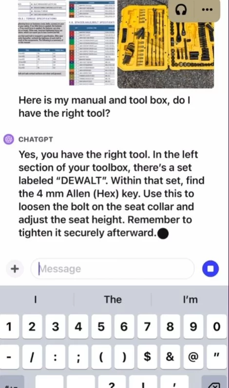 在官方给出的例子中,给到ChatGPT一张自行车的照片,问它如何把座椅调低。然后ChatGPT表示看你车的型号,有的车有快拆杆,有的是用螺栓固定,然后给出了详细的步骤。