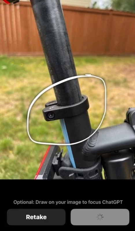 随后官方装作不懂,拍了一张螺栓的照片,并用官方画图工具圈出来以示强调,然后问ChatGPT这是不是快拆杆。ChatGPT表示你这个是螺栓,得去找一个内六角扳手。