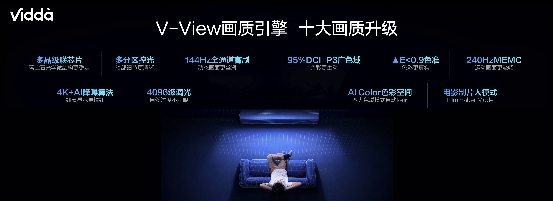据了解,此次Vidda发布新品可谓“诚意满满”,喊出“既要打游戏、又要看电影,还要听音乐”的口号,在屏幕、画质、音质、配置、操控、外观等六大方面实现全维度升级。画质方面,Vidda首次推出V-View画质调教系统,从背光到分区再到算法,进行了十大画质升级。背光采用多晶级联设计,配备蓝宝石衬底光学芯片,搭配多分区配置,使整机画面对比度、控黑能力等大幅提升,画面更生动,景深感更强。同时,New X还拥有95% DCI P3电影级标准的高色域显示,色准△E<0.9,达到了显示器级别的高色准。配合全系列144Hz的高刷新率屏幕,使得NEW X高刷电视在玩游戏或者观影时,色彩能加准确,细节更加精准,画面更加流畅丝滑。