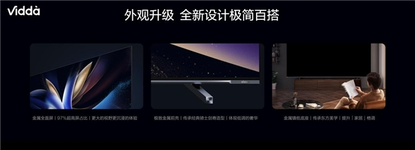 在外观上,Vidda NEW X也进行了焕新升级,采用了全新设计的全金属一体成型工艺,既坚固可靠又纤薄美观,并且拥有97.35%超高屏占比。搭配金属镇纸造型的底座,外观简洁、百搭各种家居风格。坚固可靠且纤薄美观,祛除“塑料感”,尽显工艺与科技之美!