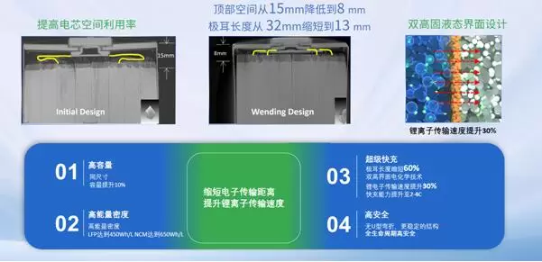 问顶技术是瑞浦兰钧自主研发的创新技术,能够使电池空间利用率提升7%以上,电池顶部空间从15mm降低到8mm,电池极耳长度从传统电芯的30mm减少到13mm,缩短电子传输路径,采用双高固液态界面技术,使锂离子传输速度提升30%。