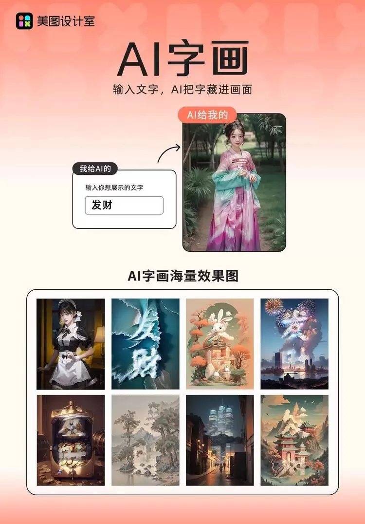 近日,美图设计室上线“AI字画”功能,用户输入文字后,可通过美图AI技术将文字巧妙地隐藏到图片中,在社交媒体上尽情展现创意。