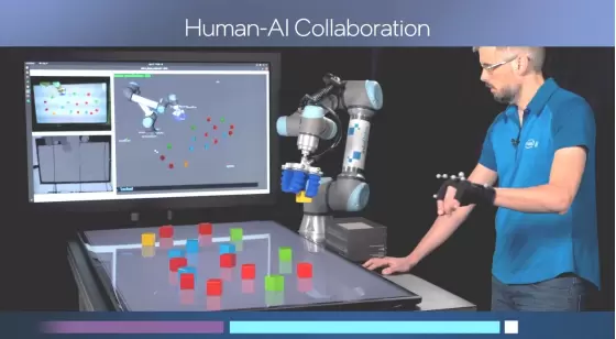 协作机器人(Cobot)正在成为面向一般体力劳动的自适应智能助手,具有颠覆性的投资回报。在这个演示中,终端用户通过VR方式(远程)操控机器人,直接完成物品拾取和放置任务。其中展示的编程过程包括机器人模仿人类,动作和实体标注,以及对模块化机器人技能的安排。这个使用场景逐步演示、介绍了英特尔在运动基元、增强机器人视觉和VR接口方面取得的进展,通过英特尔RealSense技术和英特尔XPU硬件实时地控制、推理、断定和行动。