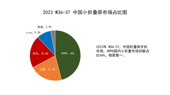 权威调研机构最新数据显示,2023年W36-37中国折叠屏手机市场,OPPO国内小折叠市场份额占比46%,稳居第一。OPPO 凭借Find N3 Flip创纪录的市场反馈持续引领折叠市场,广受用户喜爱。