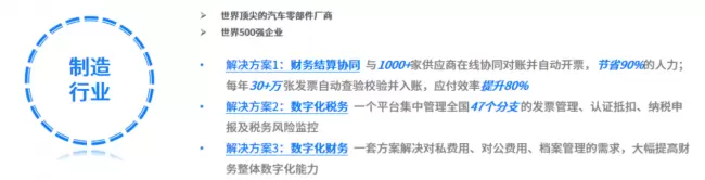 以一家世界顶尖的汽车零部件厂商为例,通过财务结算协同产品,帮助其实现与1000+供应链在线协同对账并自动开票,节省90%的人力;实现每年30万+发票自动查验校对并入账,应付效率提升80%。不仅如此,因为将集团信息集中在统一平台,实现了全国47个分支机构的高效管理,有效管控税务风险,并通过支出管理、档案管理等产品,大幅提高了财务整体数字化能力。