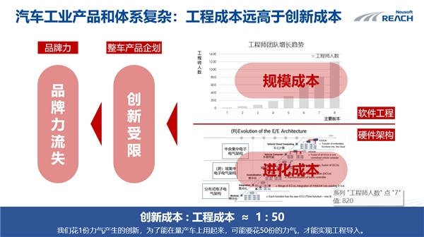智能汽车的主要成本可分为两类,一类是创新成本,一类是将创新特性搭载上车的成本,即工程成本。由于汽车工业产品体系复杂,在整车研发的过程中有大量的重复适配、软件重构工作,这些过程中的工程成本成为创新的分母,导致工程成本远高于创新成本,粗略比例是50:1,使得整个开发体系成本高昂,但创新速度依然低下。