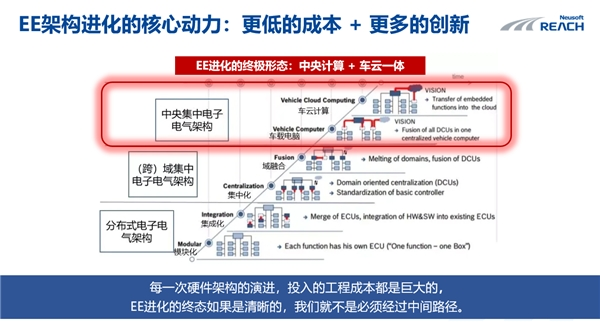 智能化的创新发展离不开整车E/E架构的持续进化,但每一代架构的演进、迭代所投入的工程开发成本都十分巨大。从经典E/E架构的发展路径看,如果最终的发展形态是中央集中式架构,在一颗芯片上集中了绝大部分智能化功能,并通过与云端算力等有机结合,同时在全新的软件架构下,第三方开发者的创新想法也可以更容易、快速地导入到车辆平台中,使得整个行业的创新效率和质量都能够得到稳步提升,车企能够在自身差异化、个性化应用的关键领域去反复打磨、复用和迭代,从而真正建立自身的品牌特性。