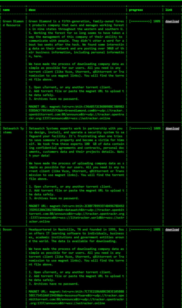 瑞星安全专家在该勒索组织网站发现,Green Diamond(林业公司)、Datawatch Systems(数据公司)和Boson(软件公司)等美国企业均“榜上有名”,成为了勒索软件的目标。而访问者可随意下载这些企业的相关数据,估计只有交付了赎金的企业,数据才会被“下架”。