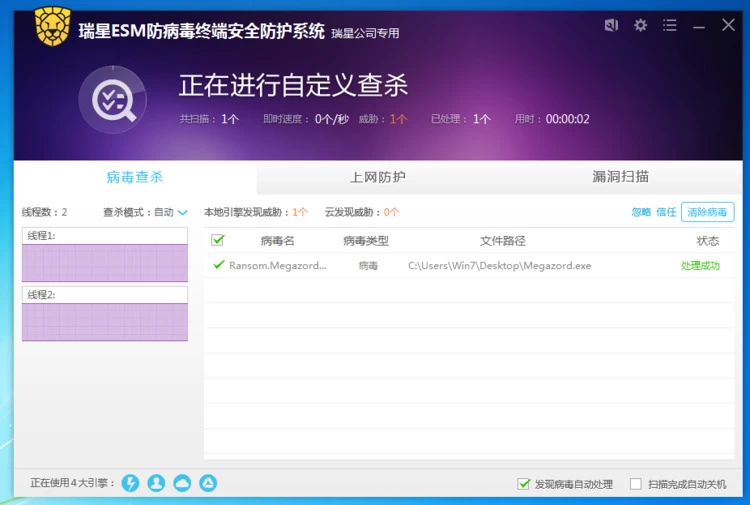 图:瑞星ESM防病毒终端安全防护系统查杀“Megazord”勒索软件