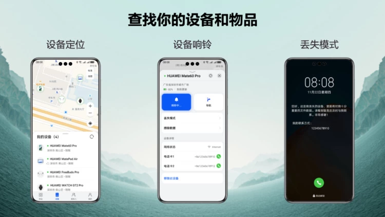 除耳机外,用户也可以将华为手机、手表、平板等设备加入“查找”网络,若不慎遗失,直接在云空间官网、查找设备App,或云空间中就能查看定位;当离设备不远时,能让其以最大音量响铃,更加便于查找;又或者将其设置为丢失模式,并留言持续追踪位置。如果实在不放心,用户更可以选择一键擦除本地数据,彻底避免数据泄露的风险。