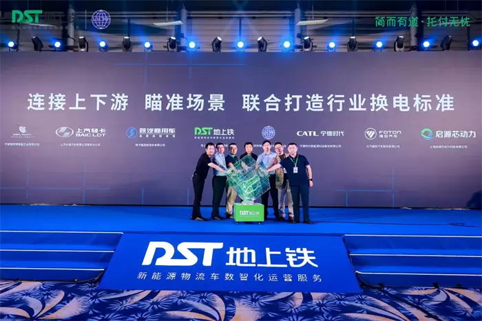 作为行业领军企业,地上铁牵头发起了轻卡换电行业标准的倡议。地上铁新能源车服网络副总裁袁果,宁德时代新能源科技股份有限公司物流车&叉车业务总经理陈光强,宁波格劳博智能工业有限公司总经理张文博,上海启源芯动力科技有限公司副总经理栓柱,陕汽集团商用车有限公司总经理田强,北汽福田汽车股份有限公司事业部总裁宋洋,上汽大通汽车有限公司南京分公司新能源营销总经理杜巧生,一起发布了行业换电标准倡议:连接上下游,瞄准场景,联合打造行业换电标准。