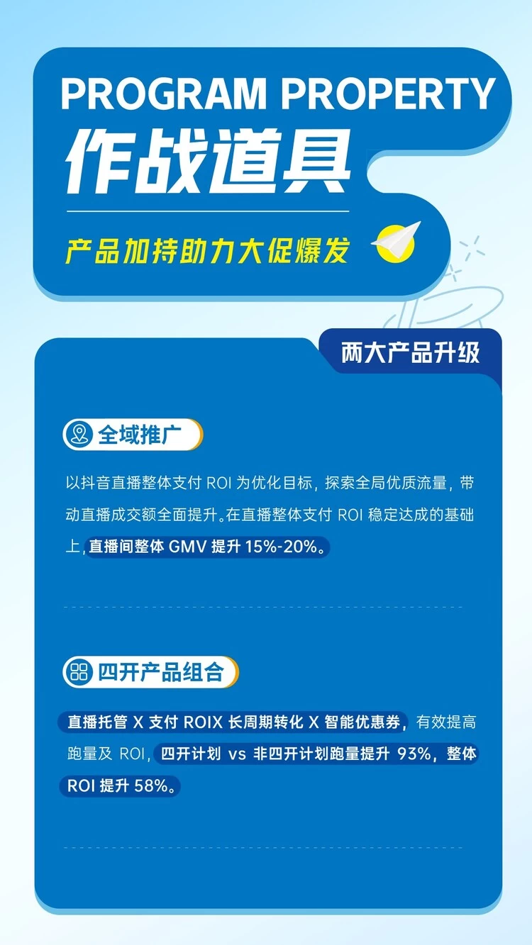 今年的巨量千川双11好物节实现了两大产品升级,分别为全域推广和四开产品组合。