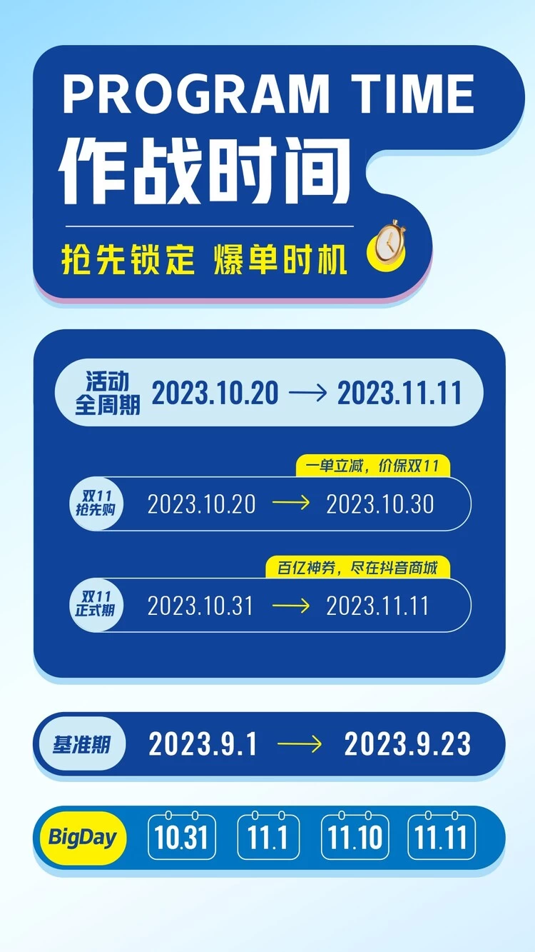 在活动时间方面,活动全周期在2023年10月20日至2023年11月11日,活动周期向前大幅拉长,目的正在于帮助商家利用充足的时间完成用户种草,提前锁定爆单时机。
