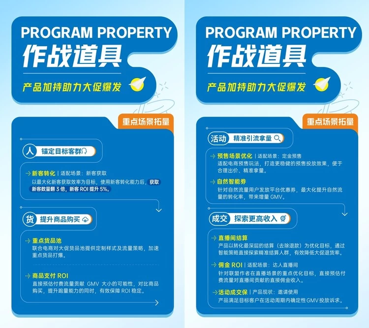 品牌广告活动,推出恒星计划2.0大促加油包,客户投放电商场景品牌广告的消费增幅达到不同阶梯,即可拿到活动反哺奖励,最高可达15%反哺,让投放更优惠。
