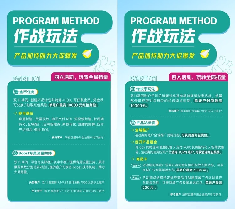 在具体的活动玩法方面,首先是从9月1日到9月23日的基准期内,日均消耗在7000元以上的账户,可以凭借增量部分领取红包返点奖励。而所有千川合法账户均可参与在全域推广、四开产品组合和商品卡三项产品的达标赛,领取消返红包奖励。此外还有金币任务和Boost专属流量扶持两大活动,助力商家在今年的双11玩转全局拓量。