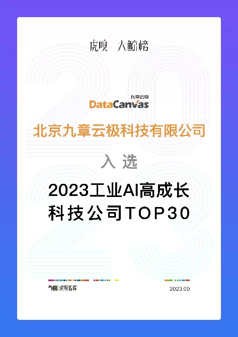 九章云极DataCanvas公司近年来持续发力智能制造行业,通过自主研发的AI软件产品和系列解决方案,为制造行业数智化升级提供一站式全流程的AI基础“软”设施服务,并不断拓宽制造行业多样业务场景中AI应用的广度和深度,加速AI规模化应用。凭借领先的前沿AI技术和丰富的场景建设经验,在9月7日至8日召开的虎嗅2023工业AI大会上,九章云极DataCanvas公司荣获“大鲸榜·2023工业AI高成长科技公司TOP30”,再次印证公司赋能制造行业数智化升级的AI基础软件能力备获市场及媒体认可。