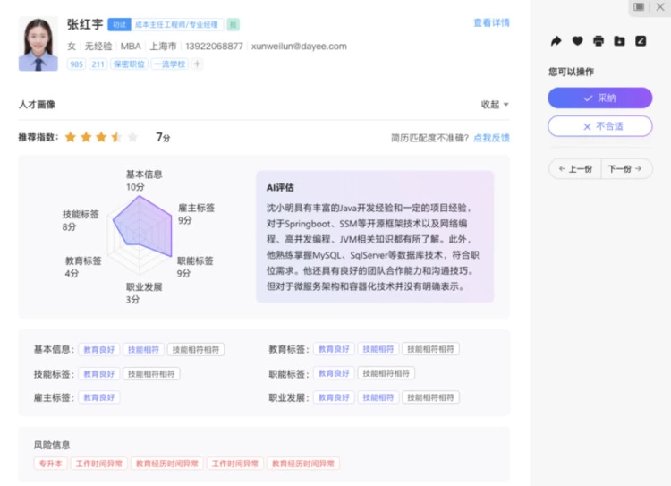 基于大模型的自然语义分析能力,系统会根据候选人的优势和短板智能生成六维雷达图,让HR快速捕捉候选人与岗位的匹配度。同时,候选人的潜在风险,如空档期、教育经历异常等,也会被系统精确地识别,有助于降低招聘失误的风险。