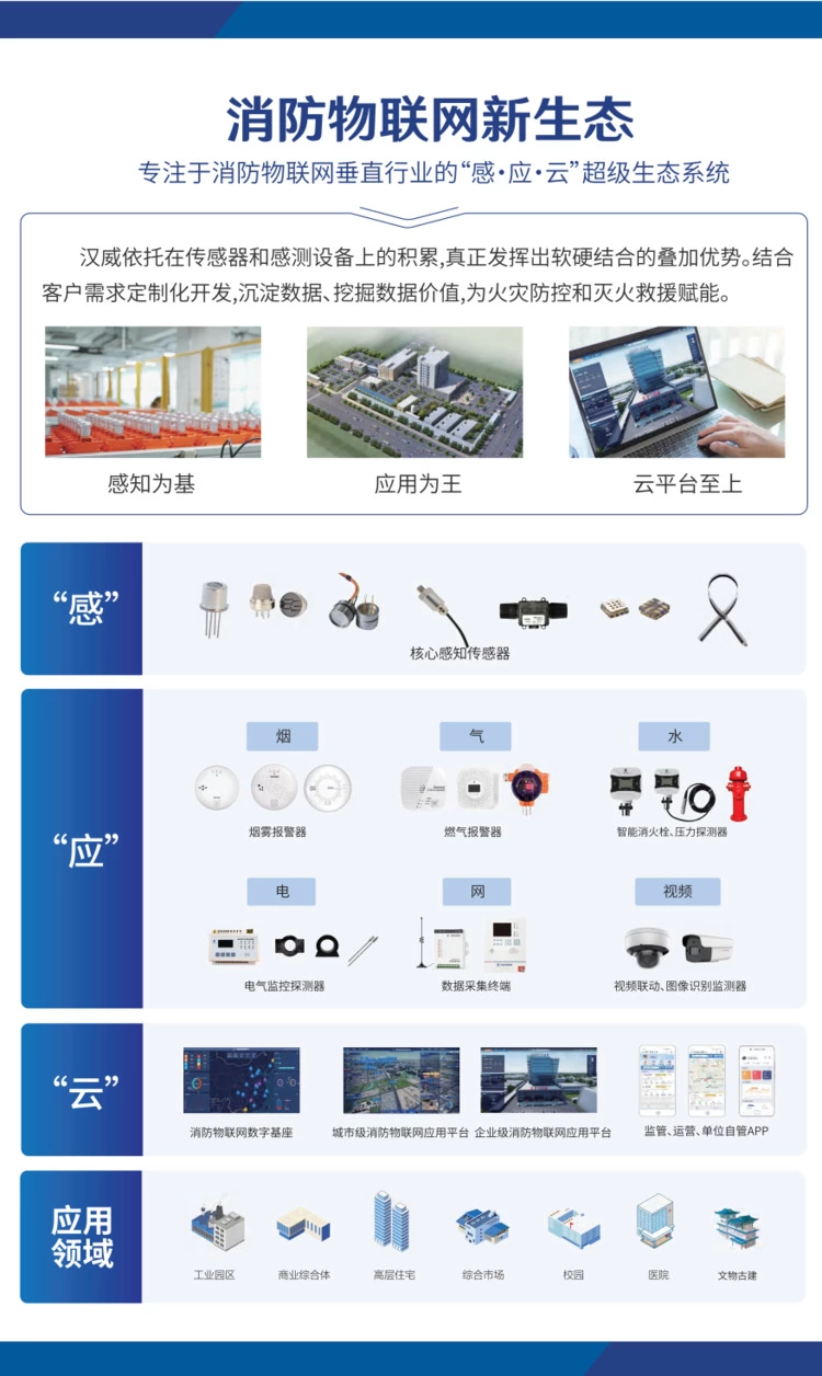 汉威科技集团基于各类高性能底层感知设备以及物联网、大数据等技术,可动态捕捉烟雾、火焰、可燃气体、消防设备、人员等信息,并进行实时可视化监管,一旦出现险情,及时进行现场报警、联动报警,广泛适用于政府监管部门、消防队站、城市轨道、工厂、园区、储能、商场、医院、学校、九小场所、社区、养老机构、公共建筑等场景,在全国已有诸多成功应用案例。
