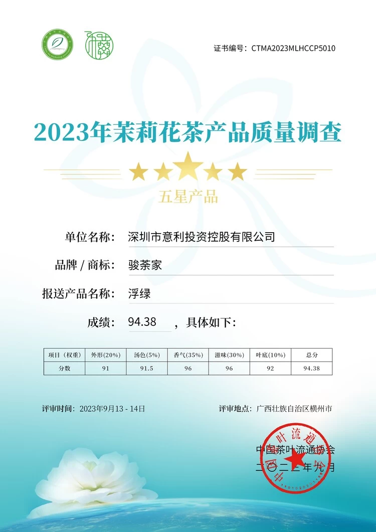 近日,中国茶叶流通协会组织开展了“闻花问茶,有品有牌”一2023年茉莉花茶产品质量与品牌调查活动。骏荼家【浮绿茉莉】从参评的118个茶品中脱颖而出,荣获2023年中国茉莉花茶产品质量调查“五星产品”称号,这也是本次评选的至高荣誉。
