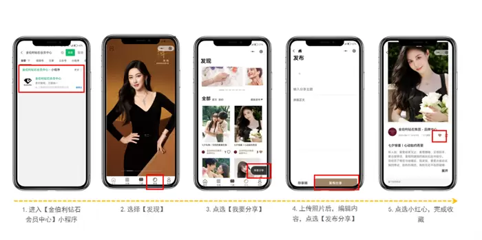 活动期间,顾客在小程序会员中心【发现页】分享于金伯利钻石店内场景的甜蜜合照,收藏数最高的前5位,分别获得品牌定制丝巾1件,浪漫婚礼季,好礼加码,说出你的LOVE宣言!