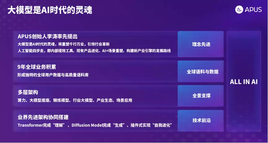 APUS转型AI的背后是一场长达九年的技术长跑。从2018年试水AI到2023年All in AI,APUS五年蓄力入局大模型,以“理念为先”护航人工智能行稳致远、以全球语料与高质量数据提升大模型价值观与应用格局、以全景支撑为AI长足发展带来核心驱动、以先进架构协同搭建。APUS异军突起的底气,就在于此。
