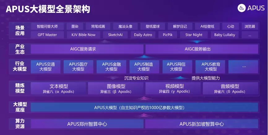 为了更好地进行AI全景支撑,APUS通过自建国内郑州智算中心、新加坡智算中心并不断扩容,为APUS大模型推理及行业应用搭建起了扎实的算力基础。
