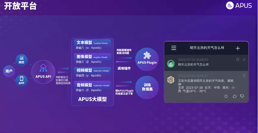 不同于其他产品仍需要用户手动选择插件,APUS大模型在设计时便采用了插件式架构,无需用户干预,就能够使大模型实现目标驱动,进行自我进化。