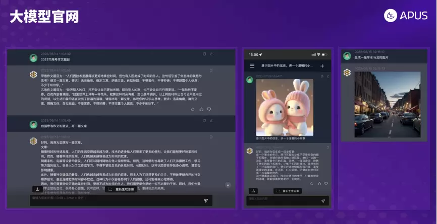 与此同时,基于APUS大模型能力,用户只要打开APUS大模型官网,即可方便快捷地体验问答、作文、文生图、图生文等功能。