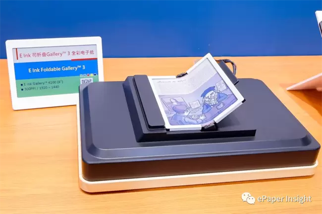 本次展会还展示E Ink可折叠的Gallery™3全彩电子纸技术。E Ink Gallery™3采用全彩电子墨水技术,能够呈现丰富、生动的彩色图像和文字,具有高分辨率的显示能力,适用于电子书阅读器、数字画廊、广告牌、教育工具、信息显示和艺术品展示。