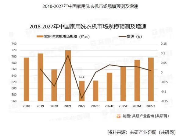 据行业最新数据显示,随着我国经济复苏回暖,2023年我国洗衣机市场微弱上扬趋势,销量达到3750万台,同比增长2.5%;销售额达到800亿元,同比增长3.9%。预计中国家用洗衣机行业2027年市场规模为696.9亿元,年复合增长率为2.2%。从数据来看,未来中国家用洗衣机行业市场规模将呈现小幅度的上升。