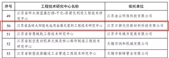 近日,江苏省科学技术厅下达2023年度省级工程技术研究中心建设项目,由江苏日御光伏新材料科技有限公司申报的江苏省晶硅太阳能电池用金属化浆料工程技术研究中心顺利获批!工程技术研究中心是依托省内创新型企业、高新技术企业等科技型企业建设的研发机构,是建立以企业为主体、市场为导向、产学研深度融合的技术创新体系的重要载体,是推进企业研发机构建设,提高自主研发能力的重要抓手。