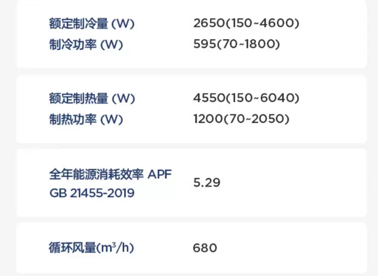 根据官方提供的参数来看,680m³/h的出风量完全能比得过市面上很多品牌的1.5匹挂机,额定制冷量也能达到2650W。