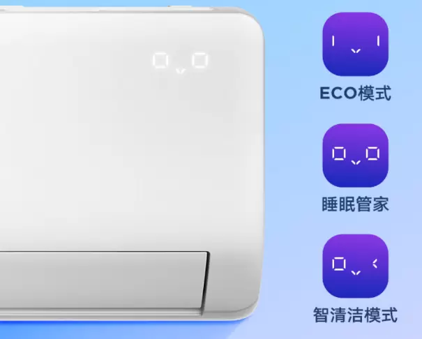 华凌空调的主市场定位就是家电品牌年轻化,简约的通体纯白色机身属百搭款,是买回去就不会出错的款式,跟各种装修风格都能融合得很好。正面右上角的一个萌趣动态交互表情设计,在不同模式下(ECO/睡眠管家/智清洁模式)会自动切换不同的表情类型,看起来非常的可爱!