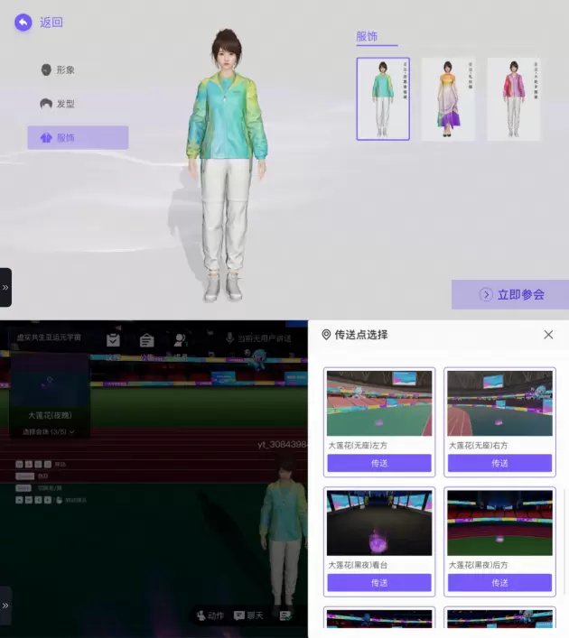 用户可以利用AI智能捏脸、手动捏脸功能自由生成虚拟形象,一键试穿志愿者服装、礼仪服、火炬手服装等亚运专属服饰,塑造自己独特的亚运数字人分身。通过手机、电脑等设备,用户可以轻松登录电信亚运元宇宙,随时随地游览“大莲花”场景。用户只需点击按钮,即可自由切换不同场馆,也可以一键传送到场馆的不同位置,全天候、沉浸式地感受亚运氛围。